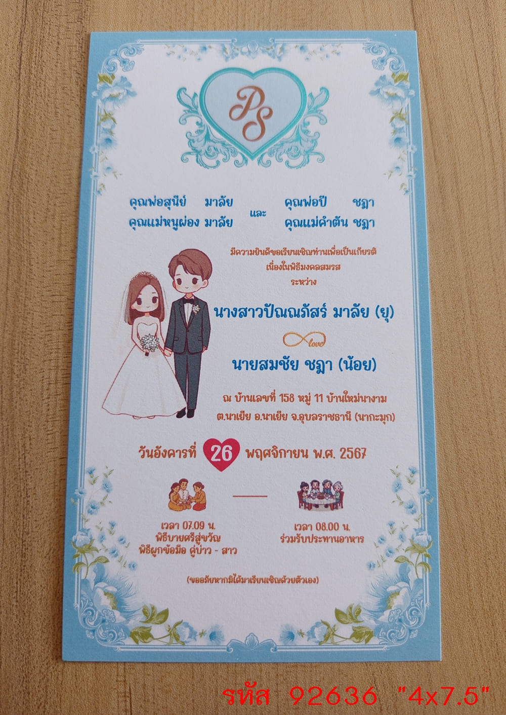 การ์ดพิมพ์การ์ดแต่งงาน การ์ดพิมพ์การ์ดงานแต่งงาน งานมงคลสมรส หน้าเดียว พร้อมซอง ขนาด 4x7.5 นิ้ว