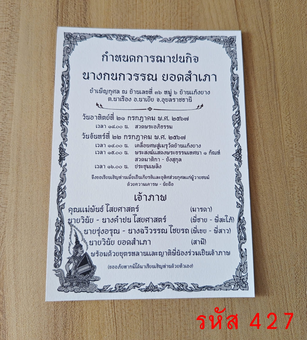 การ์ดพิมพ์ การ์ดงานฌาปนกิจ การ์ดพิมพ์งานศพ การ์ดพิมพ์บำเพ็ญกุศล หน้าเดียว พร้อมซอง ขนาด 5x7 นิ้ว